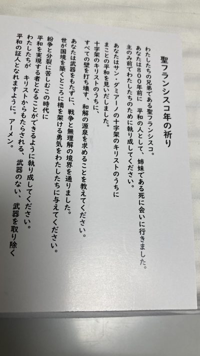 今日のミサで朗読される福音書(ヨハネ20章)には、復活したイエスが弟子たちの前に現れ、「あなたがたに平和があるように」と語りかけ、罪を赦す権能を授ける場面が描かれます。またイエスの復活を疑ったディディモと呼ばれるトマスに、「その指をわたしの脇腹に入れてみなさい」と言われ、「信じない者ではなく、信じる者になりなさい」と言われ、トマスが「わたしの主、わたしの神よ」と告白するエピソードも有名です。 ディディモはギリシャ語の双子という意味です。トマスはアラム語で双子を意味する名前です。使徒のトマスはたぶん双子の片方だったと思われます。復活したイエスは、週の初めの日の夕方、弟子たちはユダヤ人を恐れて、自分たちのいる家の戸に鍵をかけていたのに、イエスが現れ、イエスの苦難の時にイエスから離れて逃げてしまっていた弟子たちを責めることなく、彼らに息を吹きかけ「聖霊を受けなさい」と言われました。また、その八日後に今度はトマスがいた時に現れたイエスは、トマスの不信仰を責めたりしなかったのです。神のいつくしみの主日は、「神の慈しみに信頼し、自らも隣人に対して慈しみ深くあること」が、この主日の中心的な呼びかけとなっています。4月6日の朝、ニュースを見ていたら教皇レオ14世が、「戦争をする力がある者」に対し「平和を選択する」よう呼び掛けた。いうテロップが流れました。昨年5月の就任後初の復活祭に際し、教皇レオ14世は世界を荒廃させている紛争の規模に無関心であってはならず、平和のために積極的に行動するよう国際社会に呼びかけました。先週の日曜日(3月29日)には、戦争を始めた「血塗られた手」を持つ指導者たちの祈りは神に拒絶されると宣言しました。そして、「戦争をする力がある者」に対し「平和を選択する」よう呼び掛けていました。先日、日曜日のお笑い番組(笑点)で、「むかし○○だったが、今は○○である」という設定の話に「むかしは世界の警察官だったが今は世界のならず者になっている国」と答えた落語家がいて受けていました。今年はアシジの聖フランシスコの没後800年にあたり、聖フランシスコ年に設定されています。先日、教皇レオ14世の「聖フランシスコ年の祈り」をもらいました。